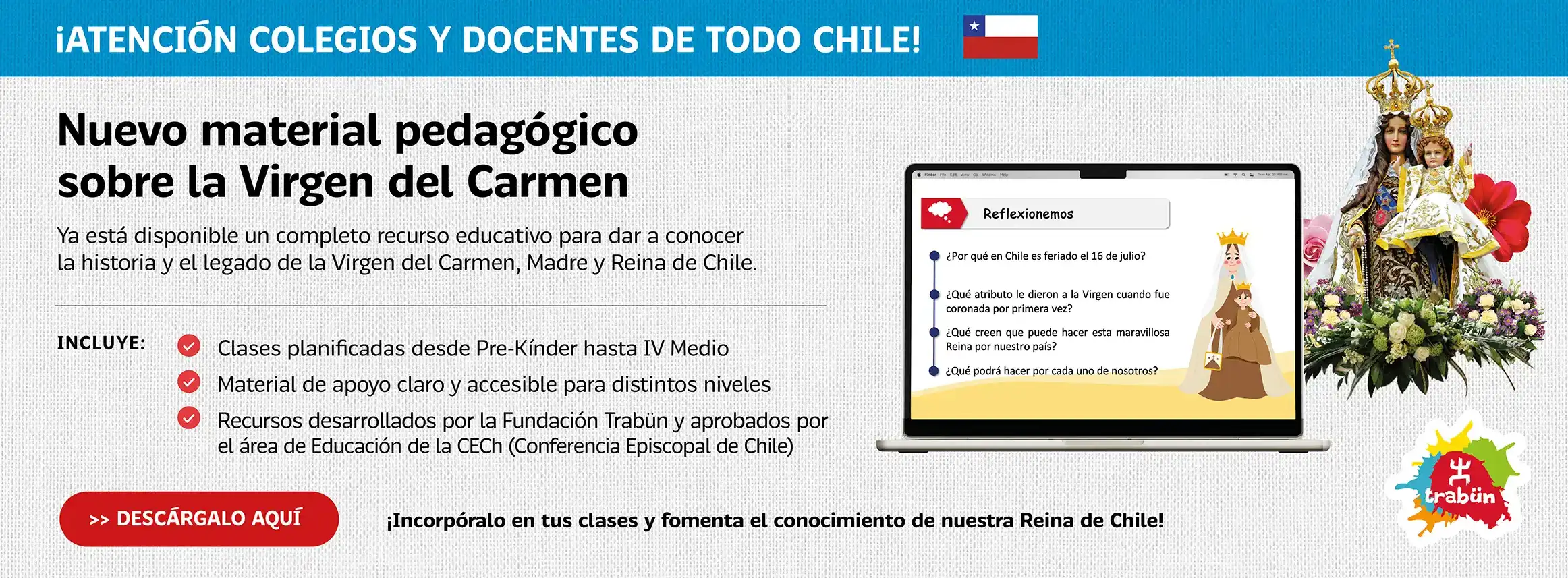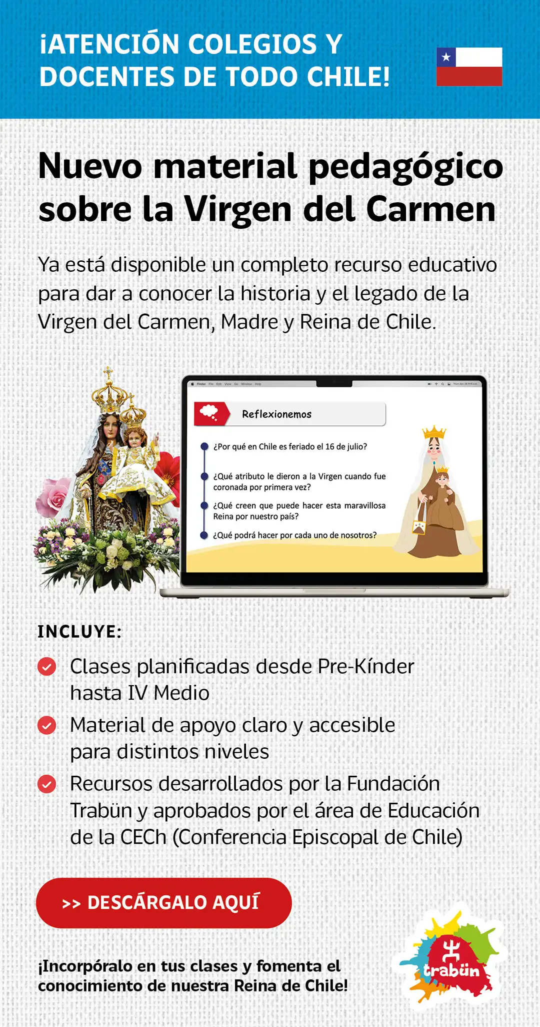 La Santísima Virgen del Carmen es invocada en nuestra Patria como Reina y Madre de Chile, Patrona y Generala Jurada de las Fuerzas Armadas y de Orden.
